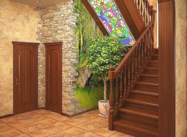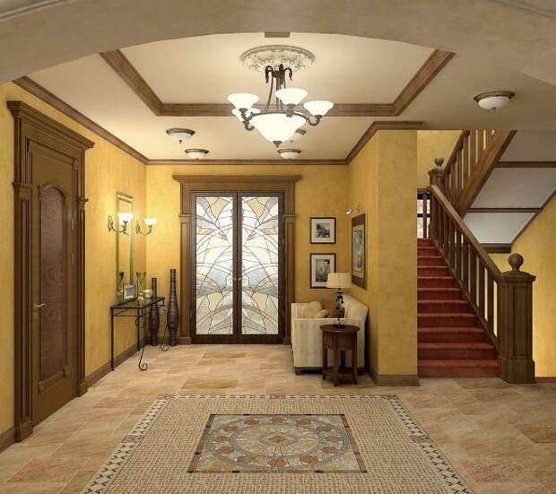 - Витраж. Выглядит интересно и красиво. Свет, проходящий через цветные кусочки стекла, меняет цвет. Благодаря этому прихожая смотрится светло и празднично даже в скучный осенний день.