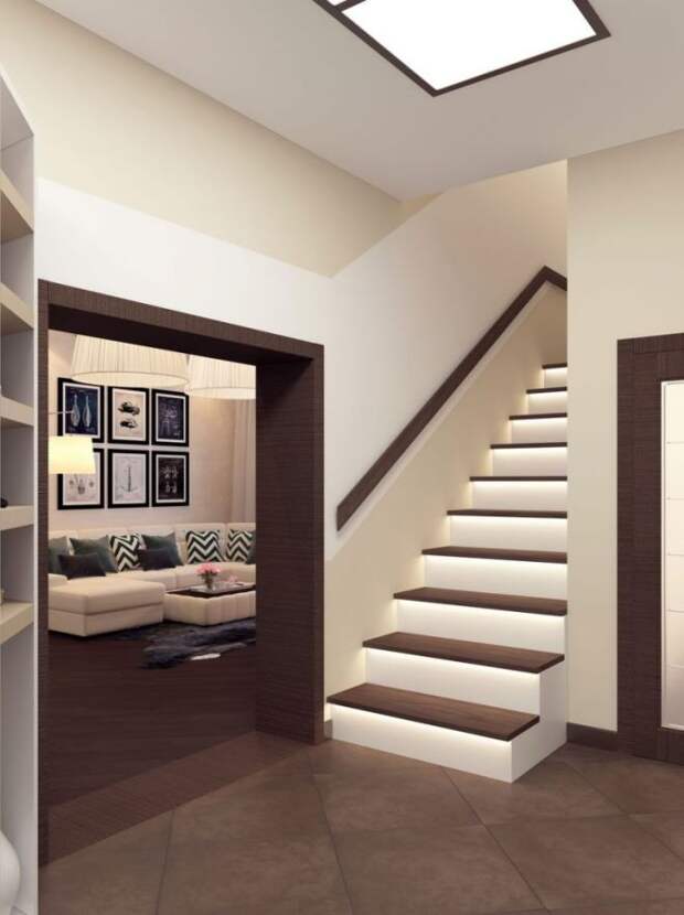 - Точечная подсветка. Если прихожая больше напоминает длинный коридор, желательно разместить малые светильники во всех важных местах: в шкафу, у зеркала, тонкую полоску на подставке под обувь. Если планировка включает лестницу, то обязательно нужно добавить лампочки у её подножия и вдоль стены вверх.
