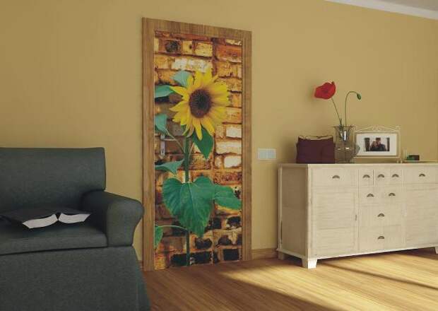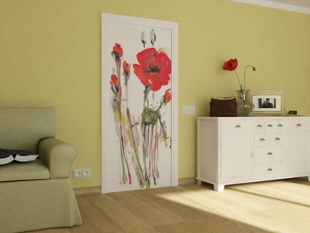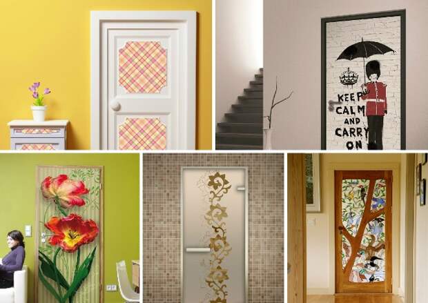 Двери подвергаются регулярному механическому воздействию, поэтому требуются плотные моющиеся обои. Дизайн зависит от вашей фантазии. Поклонникам всего нестандартного может прийтись по вкусу иллюзия леса или оживленной улицы. Таким образом можно создать потайную дверь.