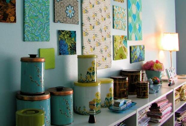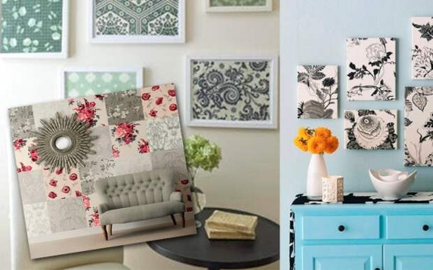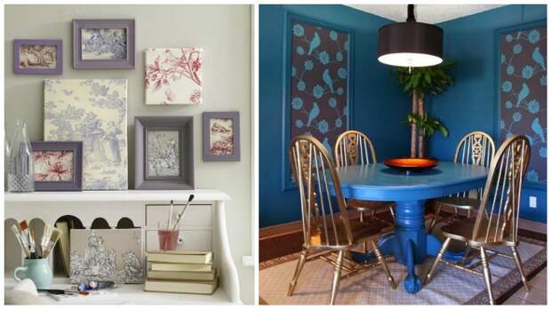 Достаточно поместить обрезок полотна в рамку со стеклом, чтобы получилась интересная картина. Из подобных картинок рождаются целые коллажи. Купите несколько идентичных фоторамок, вставьте внутрь фрагменты обоев – и украшение готово.
