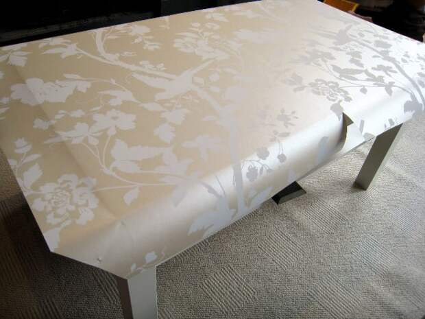 Помните, что лаковые средства делают обои темнее. Если для отделки столешницы будет использоваться виниловое полотно, замените покрытие стеклом, декоративными шурупами или «жидкими» гвоздями.