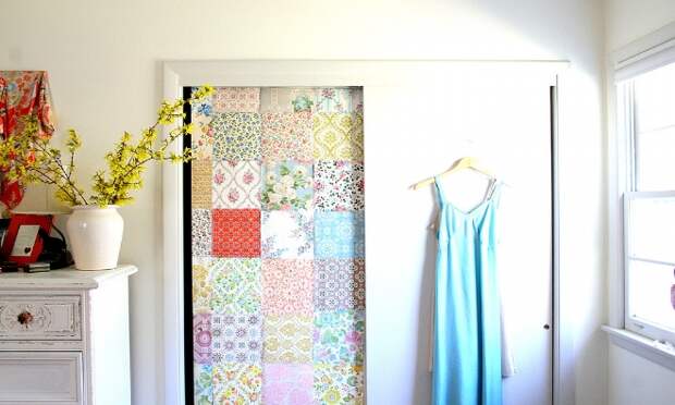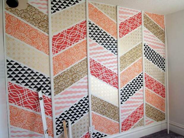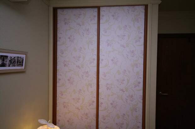 Данный прием оживляет пространство. Прежде чем отделать шкаф обоями, подумайте, насколько их дизайн будет сочетаться с окружающей обстановкой. Для добавления яркости необходимо использовать куски, отличающиеся между собой текстурой, цветом или узором. При создании портала есть смысл применить фотообои. Особенно эффектно выглядит такой вариант, если скомпоновать декор шкафа с настенной отделкой.