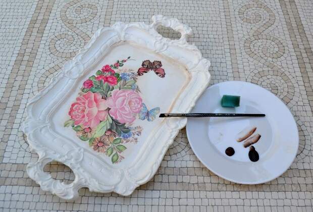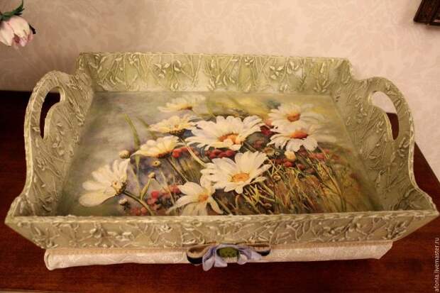 В качестве основы можно использовать не только готовый поднос, но и креативную поделку, изготовленную из подручных средств (например, из старой рамки от картины). На поверхности подноса одинаково хорошо смотрится как один вид обоев, так и целый коллаж. Выбирая полотнодля оклейки, следите, чтобы оно сочеталось с интерьером (тогда поднос превратится в предмет декора).