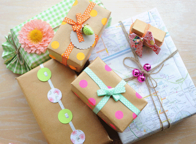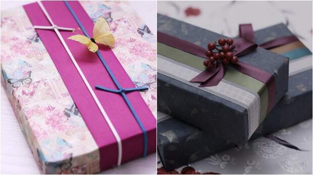 Остатки обоев – бюджетная замена подарочной бумаги. Для данной цели подойдут образцы с цветочными принтами серебристого, золотистого или перламутрового оттенка. Можно использовать и яркие однотонные полотна. Поставьте подарок на клочок обоев, заверните его и зафиксируйте скотчем. Завершите украшение атласной лентой.