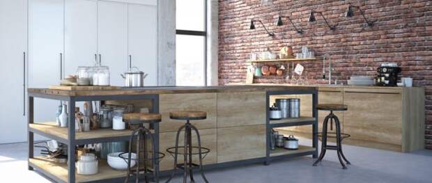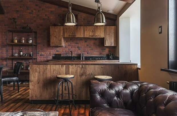 - мебель на кухне отличается лаконичностью и функциональностью. В квартире-студии модная деревянная стойка с баром обозначит границу кухонной зоны и одновременно послужит обеденным столом. Ее красиво дополнят высокие барные стулья или табуреты. Содержимое шкафов не скрывают за дверцами, поэтому часто устанавливают стеллажи и открытые навесные полки;