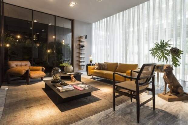 Подчеркнуть индивидуальность интерьера поможет металлическая мебель стильного дизайна – кожаные диваны и кресла на хромированных каркасах, оригинальный стеклянный столик на простом кованом основании. Угловой диван делают центром гостиной, вокруг него выстраивается остальная мебель (кресла, пуфы, столик). При этом крайне важно сохранить максимум свободного пространства.