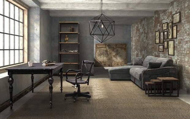 Лаконичность и брутальность интерьера подчеркнет мебель простых форм (иногда даже грубых) и выразительные аксессуары.