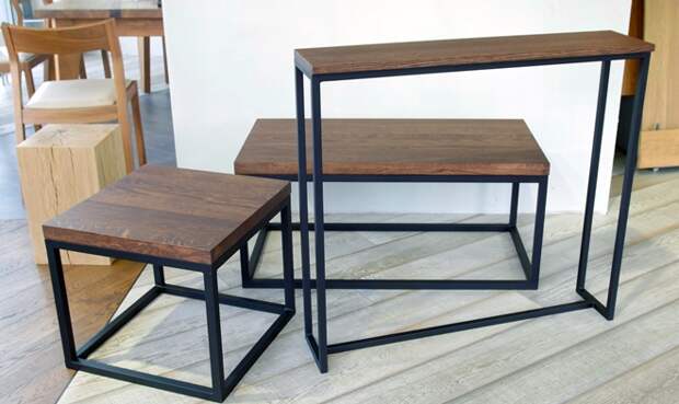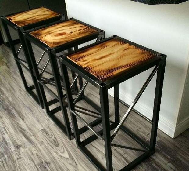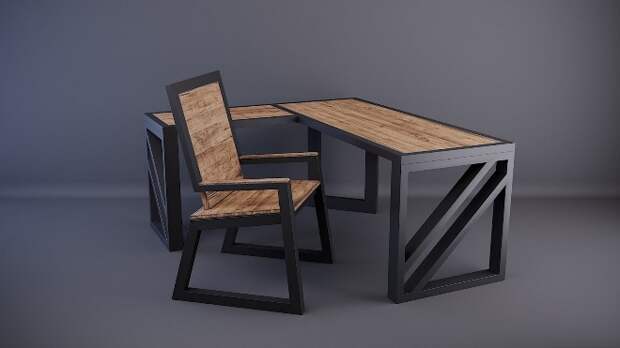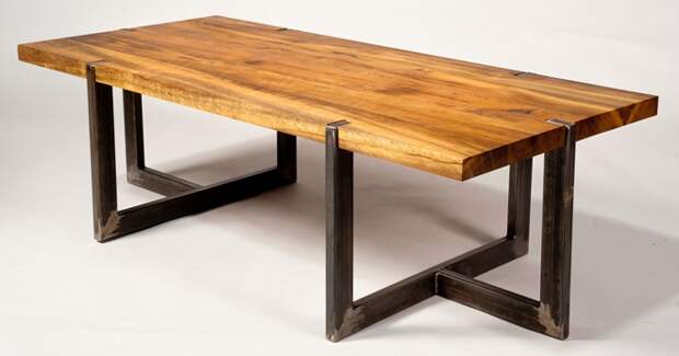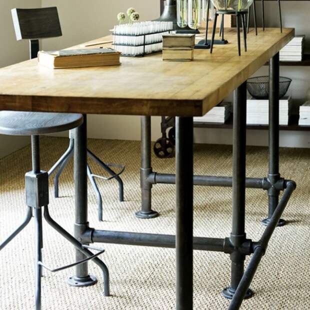 Металлический стол с поверхностью из влагостойкой фанеры органично впишется в кухонное помещение. Если установить столешницу из массива, получится оригинальный и стильный стол.