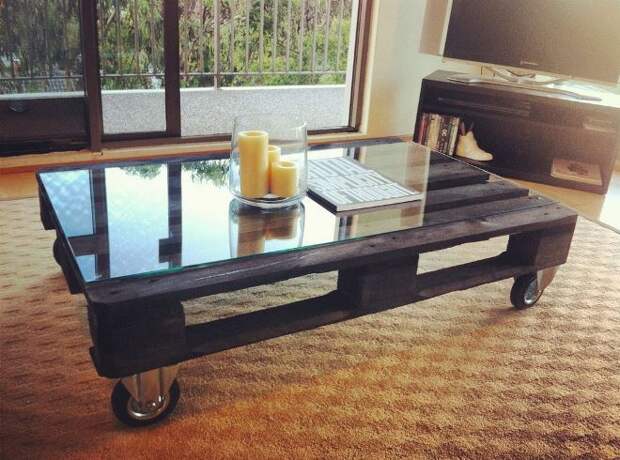 Когда заготовки высохнут, ножки прикрепляют к поддону с помощью саморезов. Более оригинально смотрится маленький столик, декорированный сверху стеклянным листом соответствующего размера.