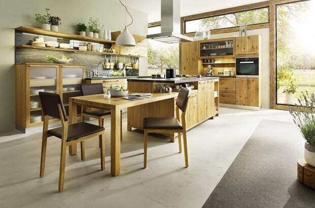 Предметы простых форм не выделяются громоздким видом. Как правило, изделия создают из массива дуба, бука, ясеня. Особенно эффектно смотрятся поверхности, сохранившие естественную структуру, обработанные маслом или воском. Предметы из массива органично вписываются в интерьеры разных помещений: