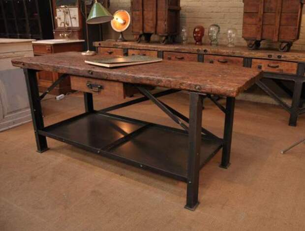 Верстак вполне можно оборудовать под рабочий стол. Выдвижные ящики из металла лучше заменить деревянными. Да и столешница из массива элегантно облагородит мебель. Особенно удобны верстаки, оснащенные блоком розеток (будет проще подключать разнообразную технику).