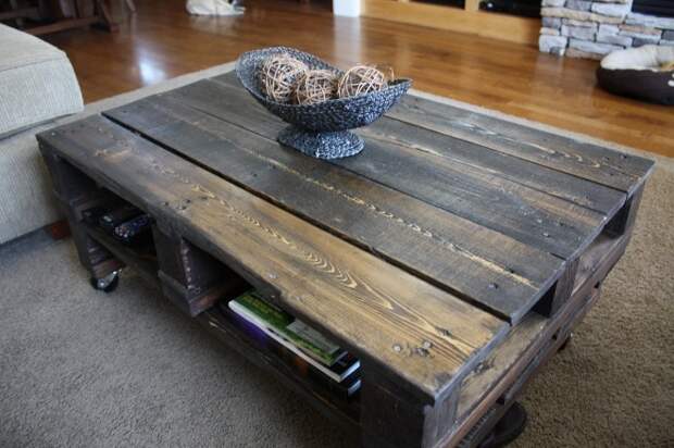 Вся работа по самостоятельному изготовлению мебели сводится к сборке, скреплению и покраске поддонов. Поэтапный процесс создания журнального столика: