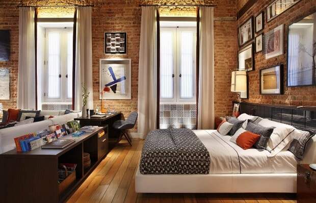 Обстановка в стиле лофт прежде всего комфортна и лаконична. Благодаря стульям, стеллажам из металлических труб пространство визуально остается свободным. Для массового хранения вещей целесообразно и практично организовывать комнаты-гардеробные.