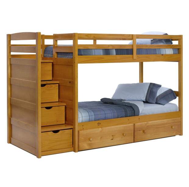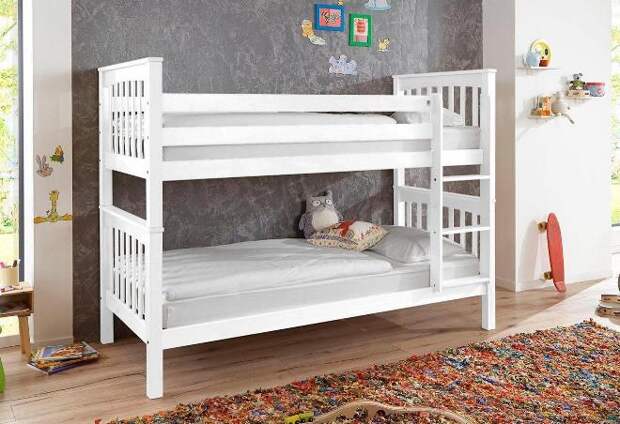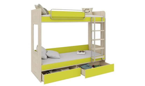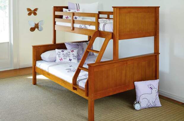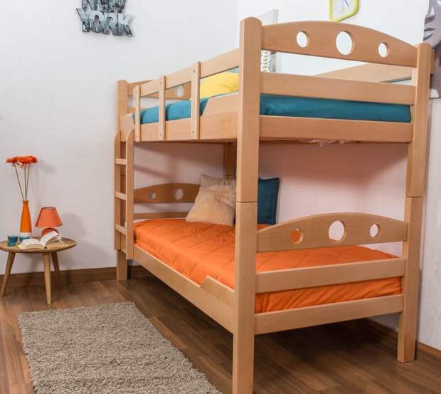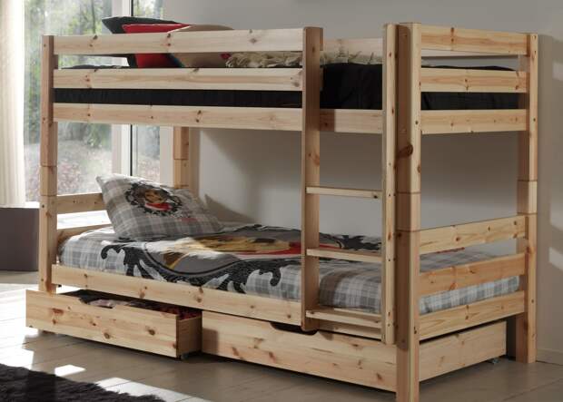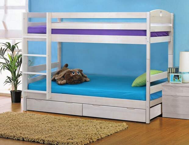 Выбирая двухъярусную кровать для детей, важно помнить о безопасности: все углы изделия должны быть округленными, не иметь острых деталей, высоких бортов.