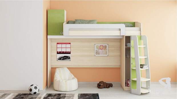 Ребенку младшего школьного возраста отлично подойдет кровать, расположенная на втором ярусе, внизу под которой – письменный стол или спортивный уголок с тренажерами.