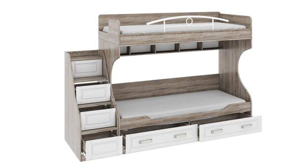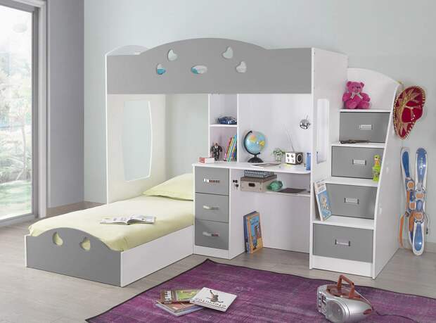Отличный вариант — модели, оборудованные комодами, выдвижными ящиками, где можно хранить различные мелочи: игрушки, белье, обувь, одежду. Это позволяет содержать комнату в чистоте. Внизу (под спальным местом) будет расположена игровая или рабочая зона. Можно поставить здесь письменный стол, шкаф. При выборе модели надо учитывать рост ребенка и расстояние от пола до верхнего яруса.