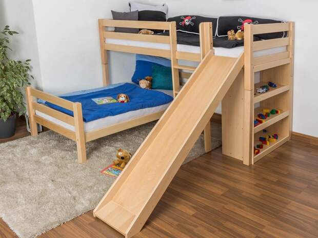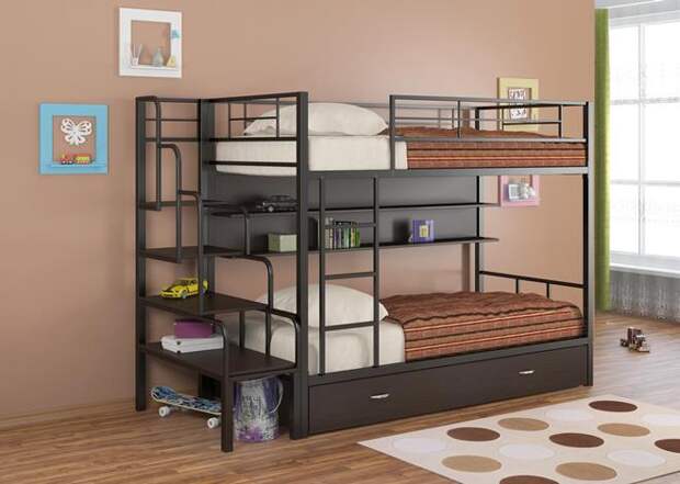 Производители изготавливают стильные конструкции для двоих, троих детей, и даже для всей семьи. Выбирайте обдуманно этот практичный функциональный предмет интерьера. Лестница, спортивные тренажеры, горка, разнообразные модули позволят родителям преобразовать кровать в место для развлечений. Практичный вариант – железные двухъярусные конструкции.