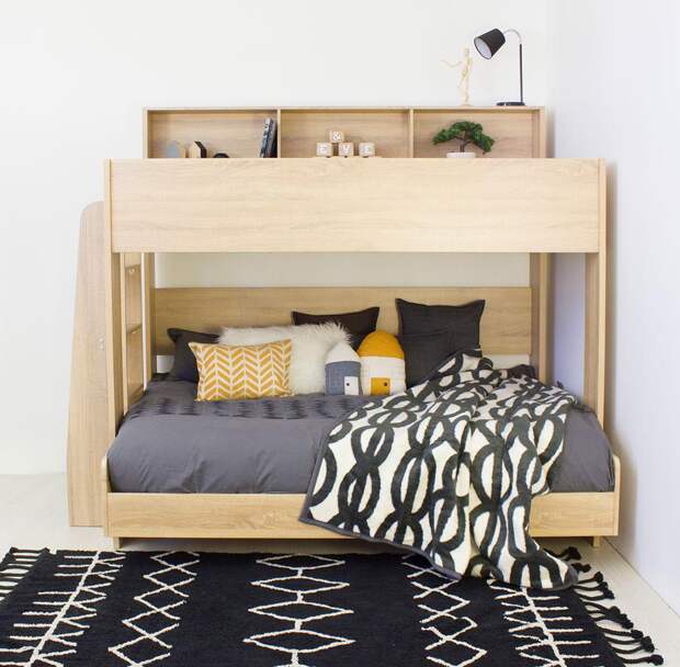 Двухъярусная кровать отлично подходит для квартир, где недостаточно места, но надо разместить несколько предметов мебели (шкафчик, тумбочку).