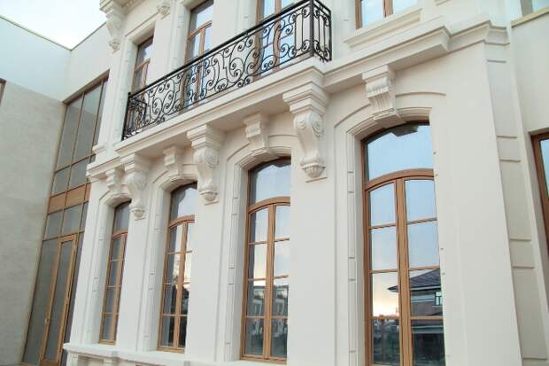 - внешний вид. Технология нанесения лепнины позволяет добиться нужного эффекта, стилизовав здание под выбранный стиль (например, восточный);