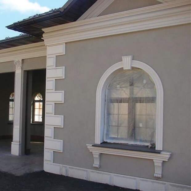 При наличии определенных добавок гипс можно успешно использовать для создания фасадных конструкций. Этому материалу можно придать любую форму, создать сложные узоры и орнаменты.