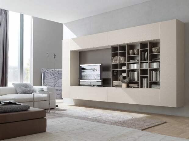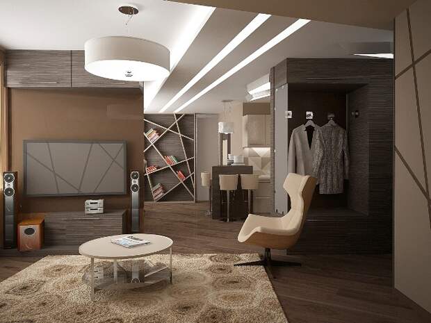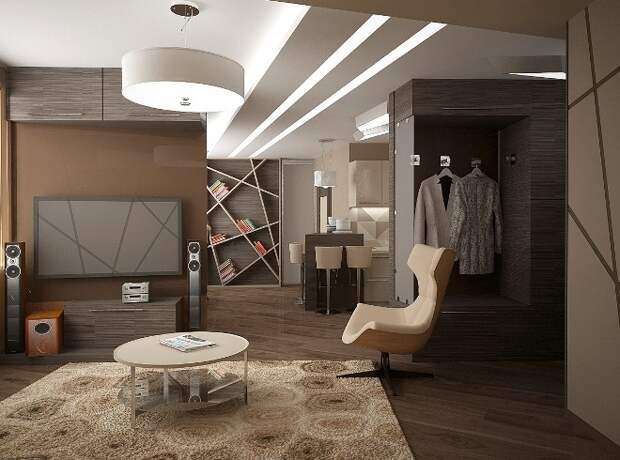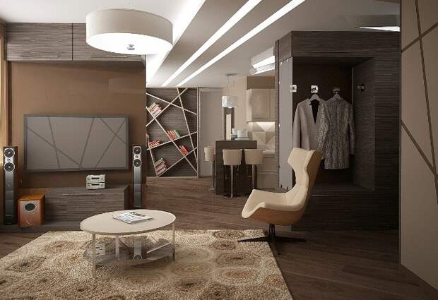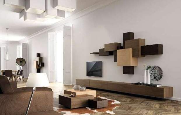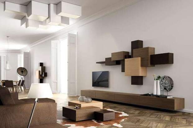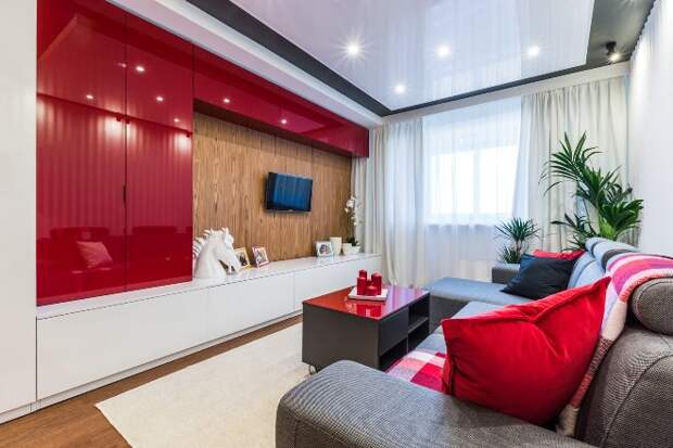 Гостиная в стиле конструктивизма подойдёт организованным, целеустремлённым людям. Небольшую комнату оформляют в светлых тонах, добавляя свет, устанавливая в потолок светильники. Встроенные шкафы с зеркальными дверями зрительно расширяют пространство. Мягкую мебель выбирают компактную, со светлой обивкой в тон к стенам. Телевизор крепят на стену, не тратя место на ТВ-тумбу.