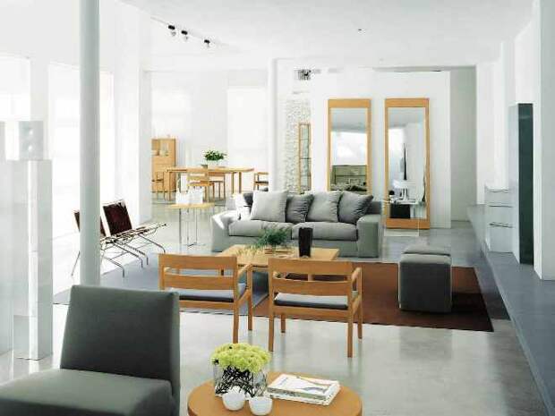 Акцент делается на высвобождение пространства. Вместительная мебель ставится вдоль стен или вешается на них, освобождая место на полу. Комнату зрительно расширяют, ставя зеркала, глянцевую мебель, используя однотонные светлые цвета для покраски стен, убирая перегородки и разбивая на зоны пространство.