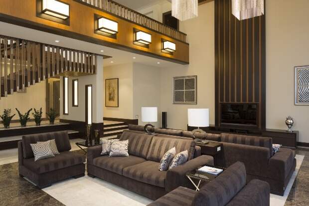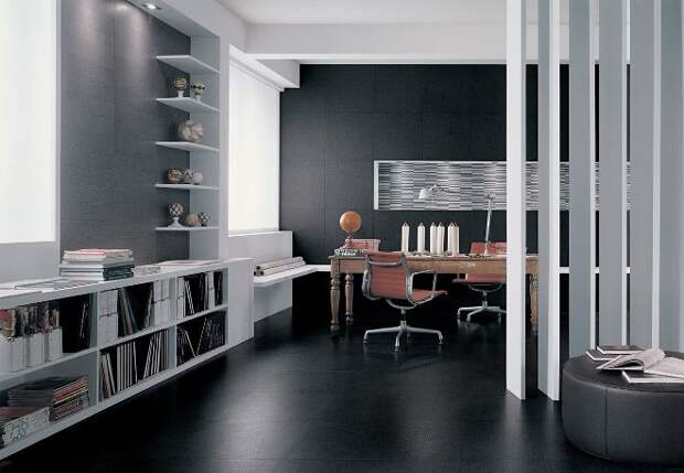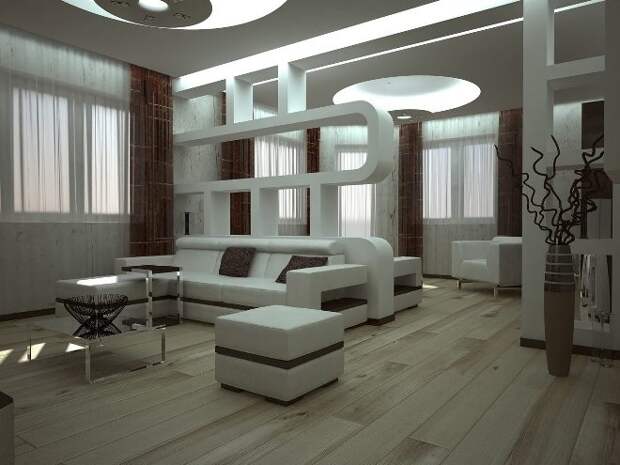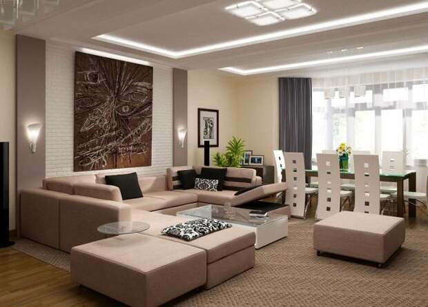 В просторном помещении можно комбинировать светлый и тёмный цвета. Контрастные стены, выкрашенные в разные тона, тёмная мебель на фоне белых перегородок или пола всегда выглядят выигрышно. В большой гостиной можно поставить полупрозрачные акриловые ширмы, выделив несколько зон для отдыха и работы.