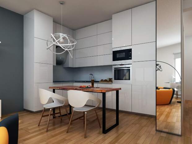 Кухня – помещение, где можно поэкспериментировать, проявить фантазию. Наливные полы или крупный кафель выглядят очень стильно. На фоне белых или светло-серых стен кухонный гарнитур любого цвета с глянцевыми фасадами из пластика будет выигрышно смотреться. Мебель с большим количеством ящиков, корзин и полок вместит всё необходимое.