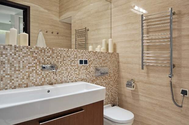Отсутствие естественного освещения компенсируется за счёт светильников на потолке и над умывальником. Зеркала в простой раме или без обрамления, хромированные детали, стекло, станут стильным дополнением интерьера.