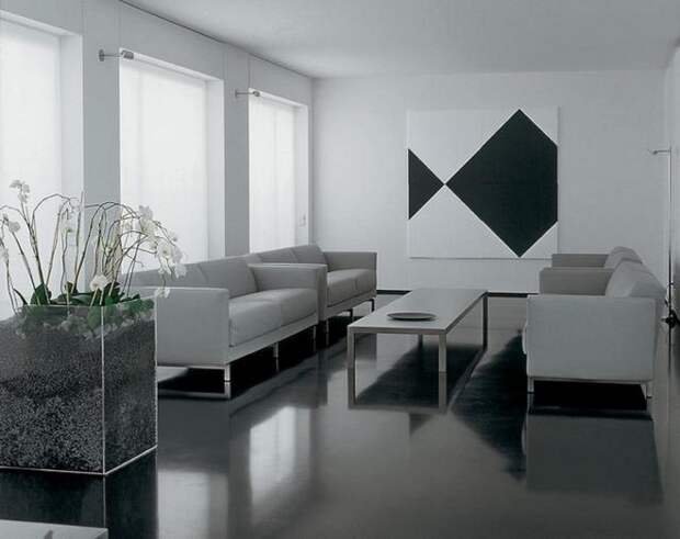 Основные цвета, используемые дизайнерами при создании интерьеров, – белый и серый. Реже применяют тёплые оттенки бежевой гаммы, тёмно-коричневый и чёрный. В качестве яркого акцента выбирают «чистые» тона красного, синего, зелёного и жёлтого. При отделке помещения делают 4 приёма цветовых решений: