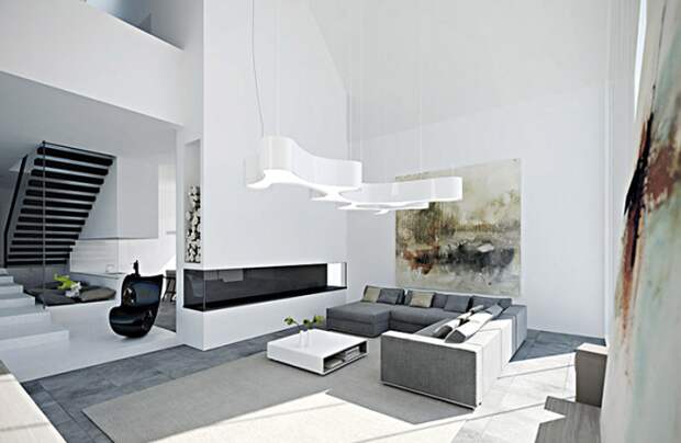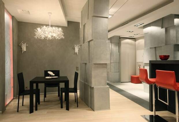 Более 3-х цветов не используют, чтобы не нарушить лаконичную стилистику. Оживляют интерьер хромированные элементы, графические рисунки на стене, выставленный определённым образом свет.