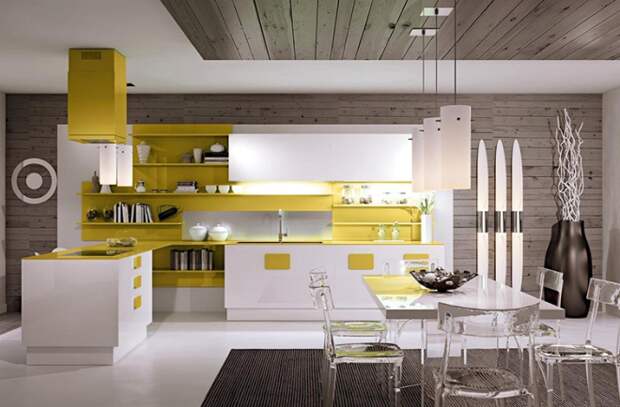 Стеновые панели и столешницы из однотонного закалённого стекла ярких цветов подчеркнут стильность кухни. Обеденные столы и стулья должны быть простой формы из пластика, стекла или металла. Бытовая техника в цветах хром и серебро гармонично дополнит интерьер.