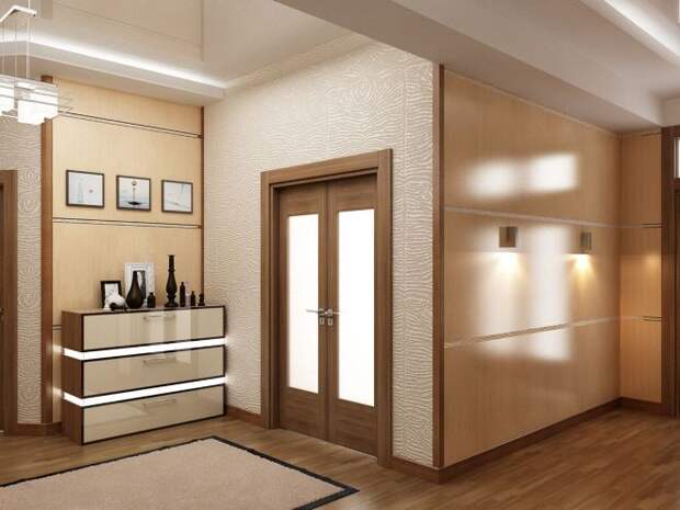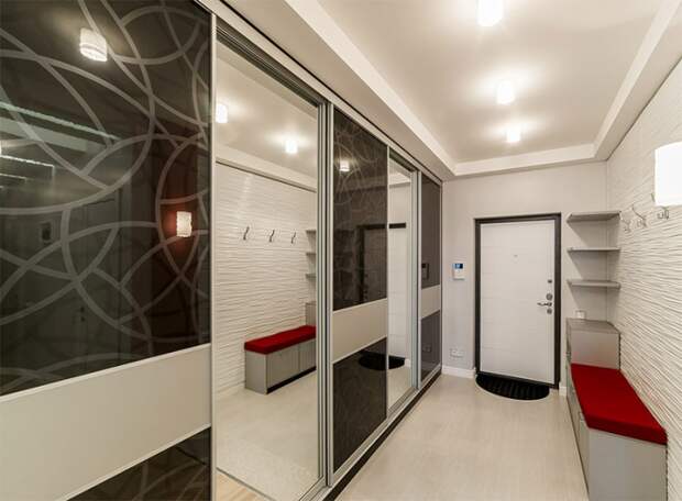 В большинстве домов прихожая представляет собой маленькое помещение без окон. Пространство зрительно увеличивают за счёт светлых стен. Ставят вместительные шкафы до потолка с зеркалами или цветными стеклянными дверями. Добавляют яркий акцент (это может быть банкетка с красной обивкой или зеркало в яркой однотонной рамке на стене).