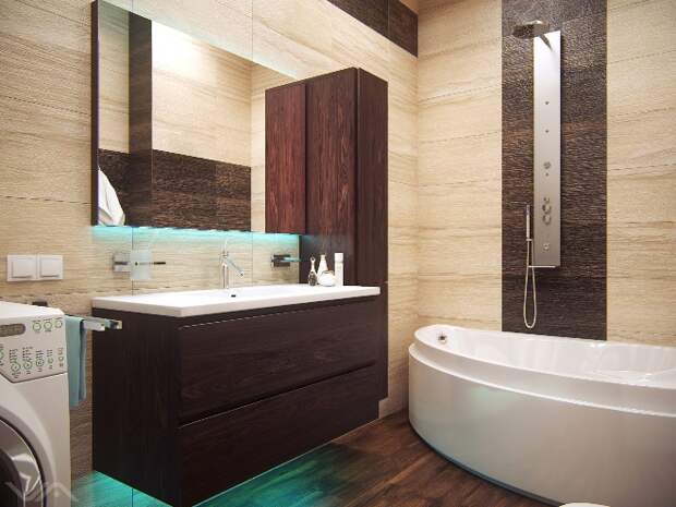 Стены и пол в ванной комнате обычно выкладывают плиткой. Для рационального использования пространства крепят подвесные унитазы, раковины, врезанные в тумбы. Ванну ставят прямоугольную или размещают компактную душевую кабину. Вместо открытых полок на стену вешают закрытые шкафчики.