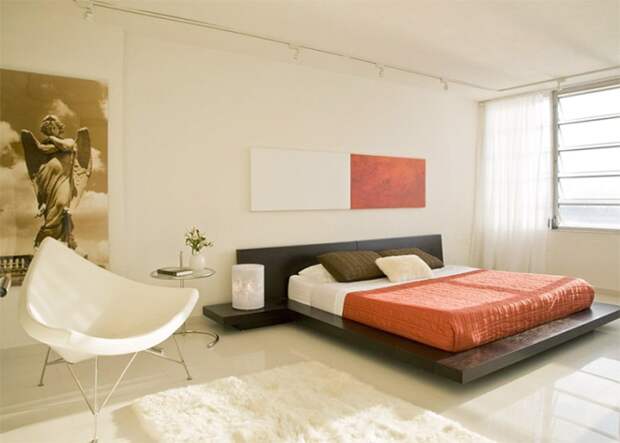Спальня – место для отдыха и сна, где необходимо набраться сил. В ней не должно быть ничего лишнего. Кровать, встроенный шкаф, 2 тумбочки, небольшой журнальный столик и компактное кресло или стул – вот необходимый максимум мебели. Все предметы строгих геометрических форм.