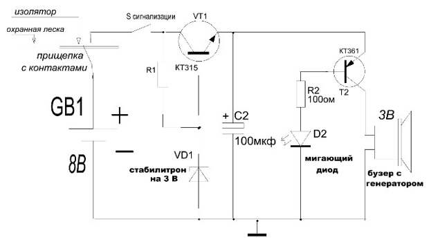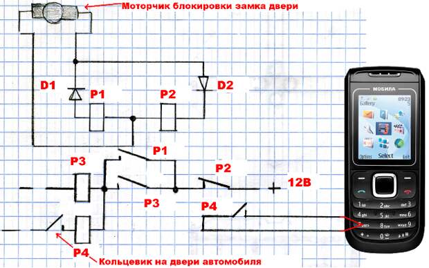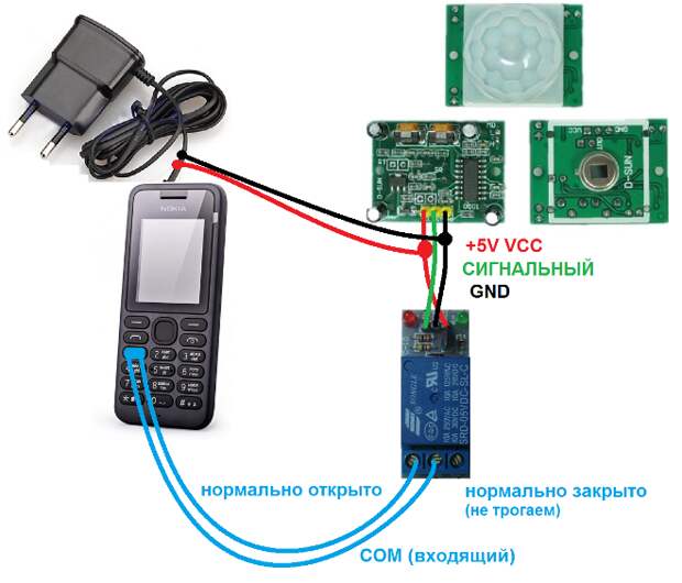 Недостаток этой схемы в том, что хозяин не знает о чрезвычайном происшествии на даче или в гараже. Чтобы сигнализация после срабатывания посылала ему сигнал, надо включить в схему старый мобильный телефон. После срабатывания датчика движения он в автоматическом режиме позвонит на заданный номер, оповещая владельца помещения.