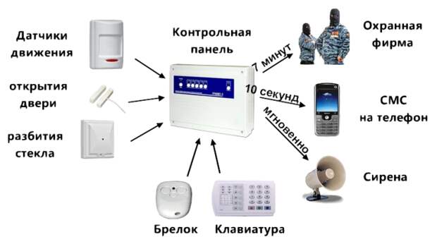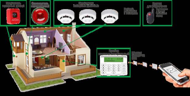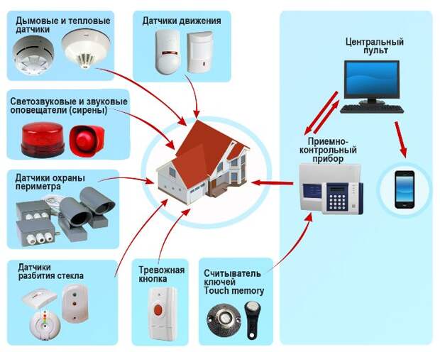 Системы охранной, тревожной и пожарной сигнализации состоят из видеокамер с датчиками движения и размещаются в зонах охраны. Когда один из сенсоров срабатывает, сигнал передаётся на диспетчерский пульт охранной фирмы или на телефон хозяину. Датчики монтируются в помещении напротив окон или дверей. Они соединяются с управляющим блоком проводами или по радио.