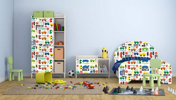 Фасады в детской можно украсить полотнами с мультяшками или картинами из любимых сказок. Подойдут для декорирования мебели в комнате ребенка и листы с ярким принтом.