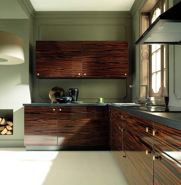 Меблировка здесь должна быть тщательно продумана. Важен и выбор отделочных материалов. Мебель под темное дерево великолепно смотрится на фоне стен молочного цвета. Украшать кухню и столовую будет стол, имитирующий изделие из массива. Для него нужно выбрать термопокрытие и поклеить его аккуратно, без пузырей и неровностей. Важно, чтобы материал для столешницы был устойчив к механическим воздействиям.