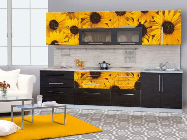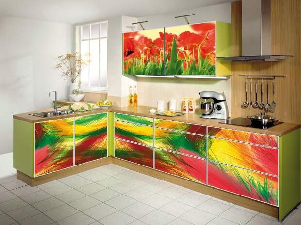 Чтобы украсить фасады шкафа или кухонного гарнитура, не нужно на них рисовать красками или наносить изображение с помощью трафарета. Можно заказать самоклеящееся полотно с любым рисунком или фото или использовать текстурированную пленку.