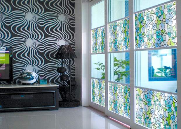 Для создания особой, камерной обстановки в комнате, можно для декора использовать витражное покрытие. Раньше его было принято чаще приклеивать на оконные стекла, но сегодня с помощью такого материала начали обновлять межкомнатные двери и перегородки.